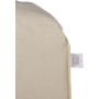 Oeko-Tex minősítésű, 180 g/m2 pamutból készült natúr színű bevásárlótáska D-alakú talppal, 43 × 34 × 13 cm méretben, 67 cm hosszúságú és 3 cm szélességű fülekkel. Oeko-Tex címkével ellátva.