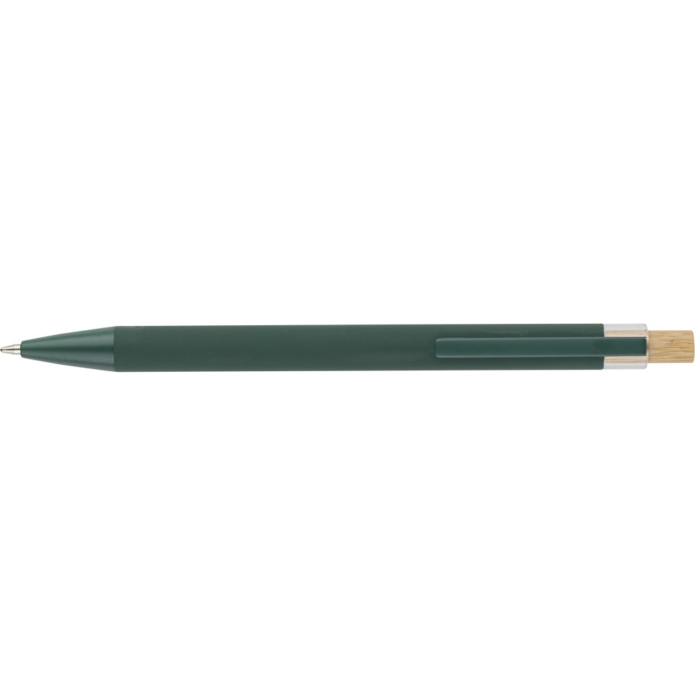 Újrahasznosított alumíniumból készült golyóstoll bambusz nyomógombbal és AS műanyag díszítéssel, fém klippel és a toll színével harmonizáló műanyag tollheggyel. A tolltesten lézergravírozott recycled (újrahasznosított) alapanyagra utaló logó található. Megközelítőleg 800 méter íráshosszúságú, kék színű tollbetéttel.