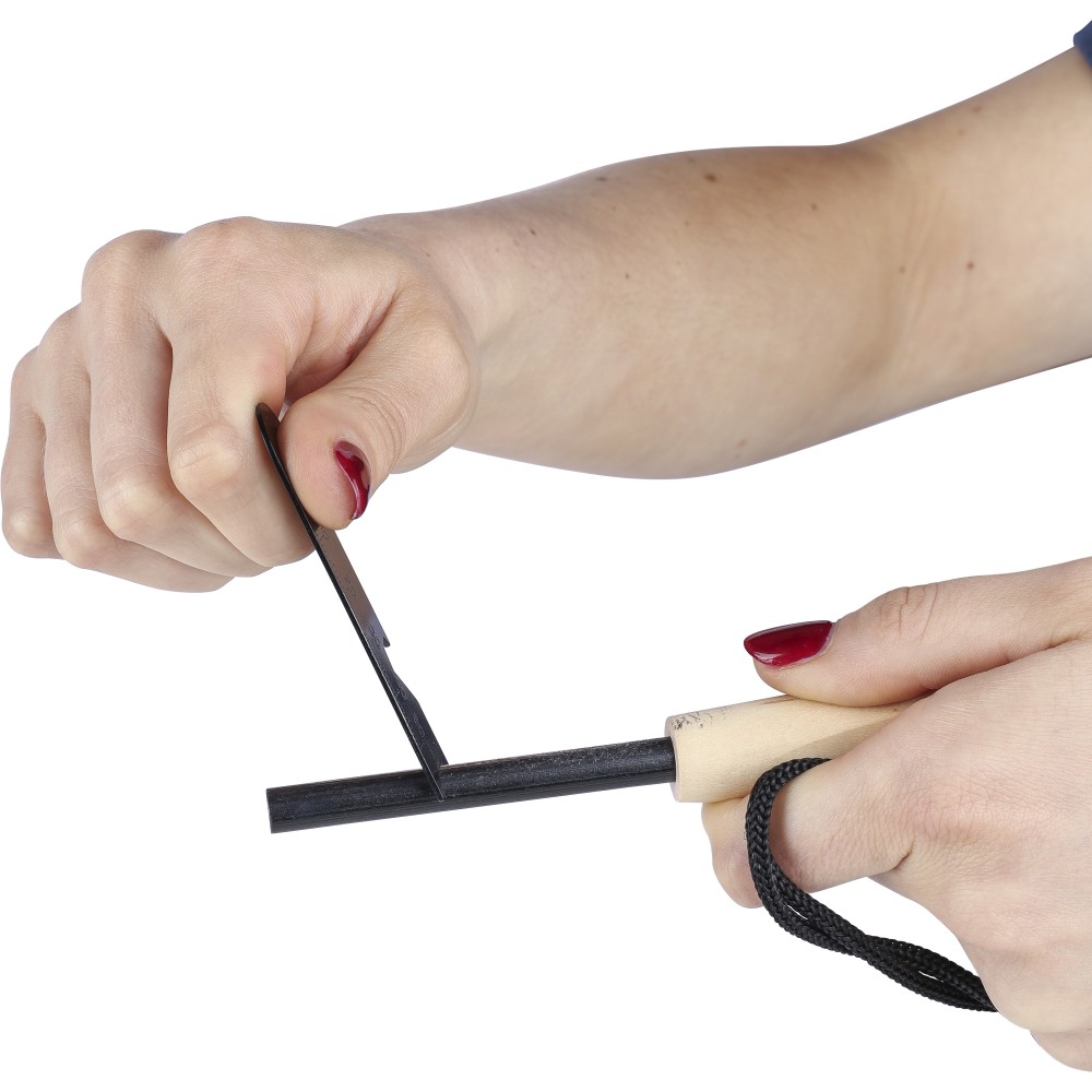 Rozsdamentes acél tűzgyújtó fenyő nyéllel és poliészter pánttal, mely csatlakoztatja a kaparóeszközt és a gyújtópálcát. A multifunkciós kaparóeszköz üvegnyitót, vonalzót és hex-kulcsot tartalmaz. Csomagolása barna papírdoboz.