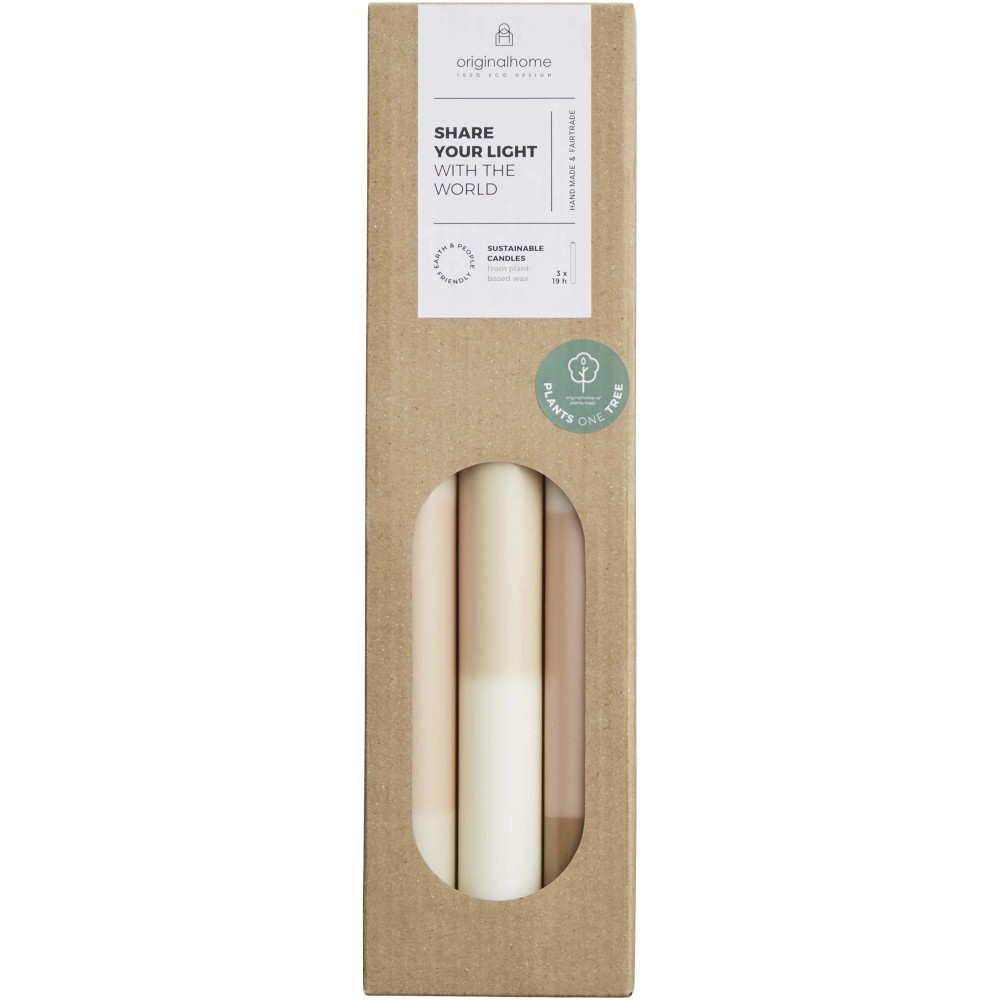 Ez a három darabból álló szett élénk színvilágú asztali mészkőgyertyákat tartalmaz, amelyek növényi alapú, paraffinmentes viaszból, kézzel készülnek. A termékek illatmentesek, 100% pamut kanóccal rendelkeznek, tiszta égést biztosítanak, darabonként 18-20 órás égési idővel. A gyertyák megvásárlása afrikai gazdák faültetési programjait, valamint egy indonéziai (Jáva) fair trade projektet támogatunk.