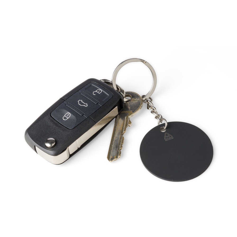 Újrahasznosított rozsdamentes acélból készült, gumírozott felületű focis kulcstartó fém karikával. A kulcstartón gravírozott recycled (újrahasznosított) alapanyagra utaló logó található, amely gravírozás után fényes, tükörszerű hatást mutat. Egyenként kraft papírtasakba csomagolva.