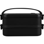 Kétrétegű uzsonnásdoboz több rekesszel (2 x 400 ml) és bambuszfedéllel. Tartalmazza az elválasztót és a műanyag evőeszközöket (kanál, villa és kés), valamint a rugalmas szalagot. PP.