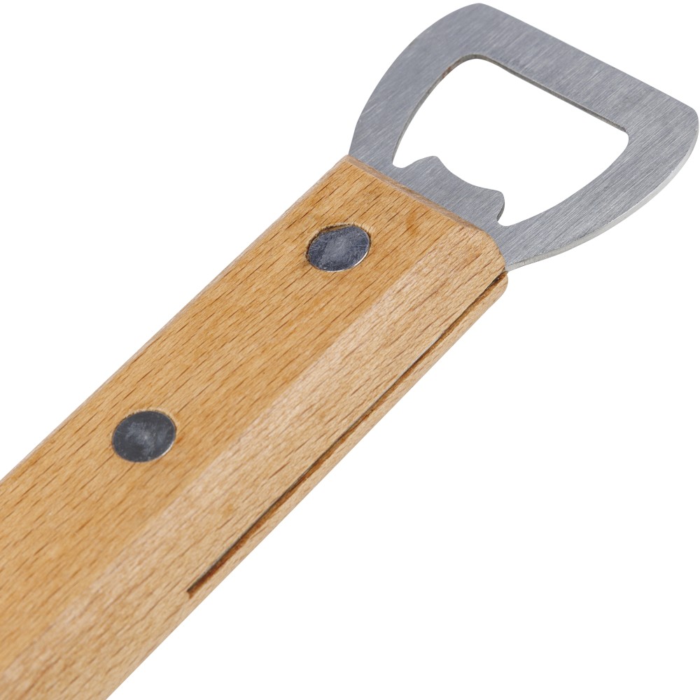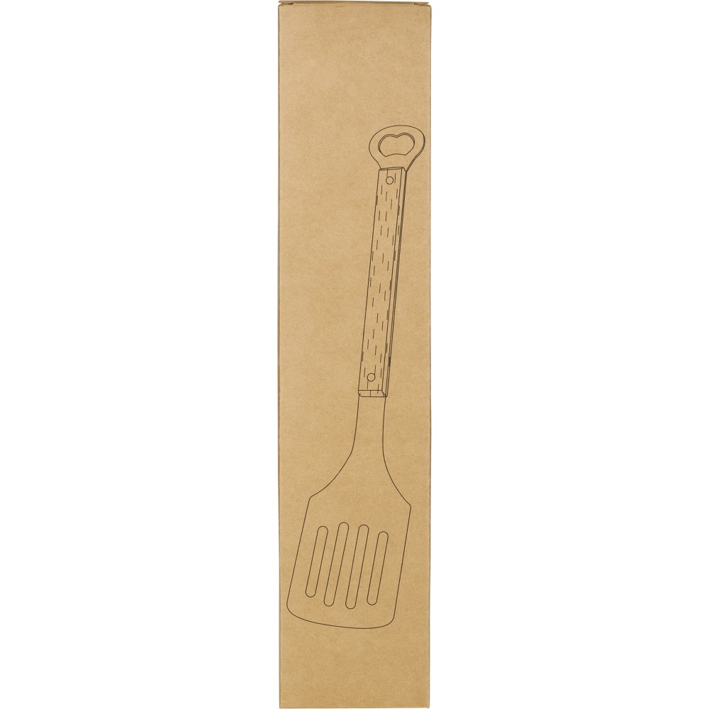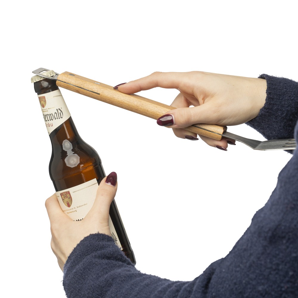 Rozsdamentes acél barbecue lapát bükkfanyéllel, a végén integrált sörnyitóval. Darabonként barna kartondobozba csomagolva.