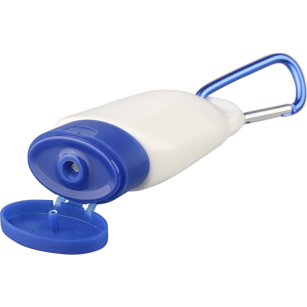 SPF 30 faktorszámú naptej színes kupakkal és a kupak színével harmonizáló karabinerrel. A hátoldalon az összetevőlista és a minőségmegőrzési idő szerepel. Szavatossági ideje 2 év. 30 ml.