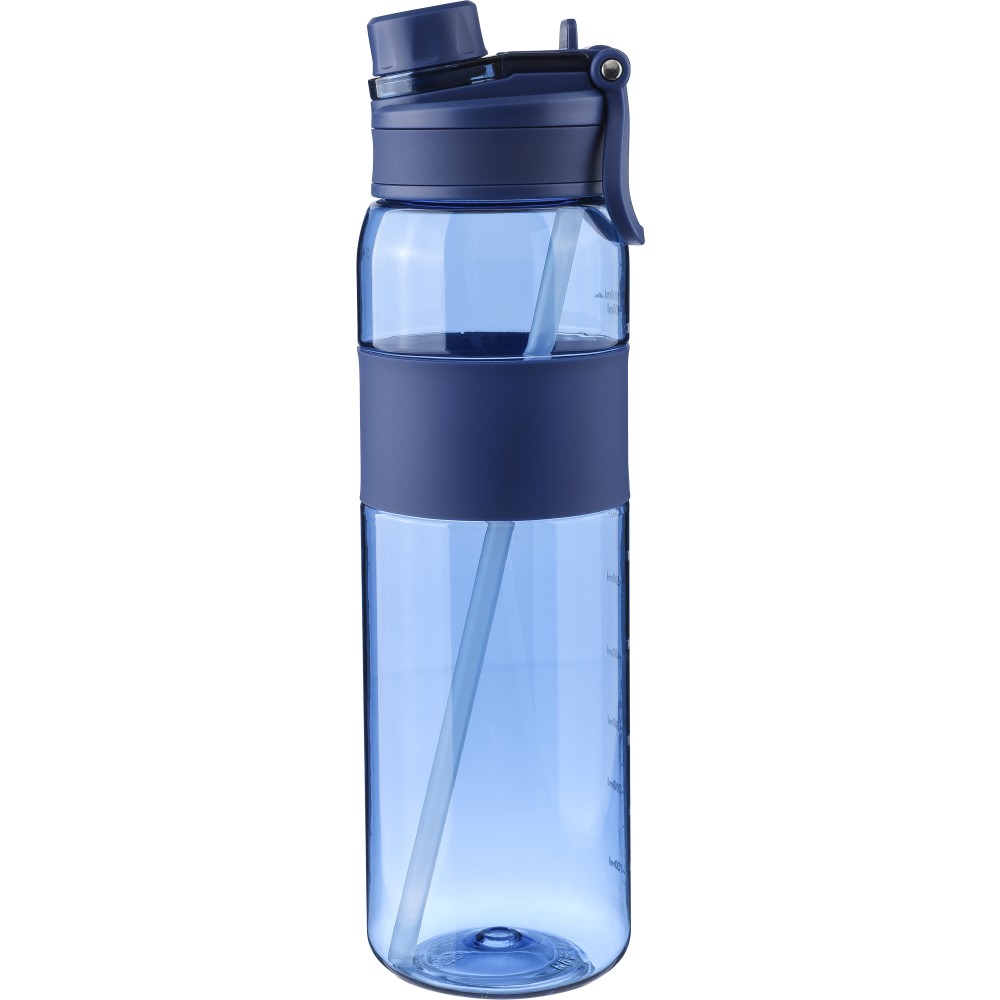 Tritán kulacs, 900 ml-es. Kétféle használati lehetőséggel: csavaros záródású kupak vagy visszahajtható végű szívószál. Szilikon markolattal, PP hordozófüllel és nyomtatott űrtartalom-jelzővel.